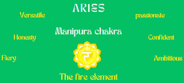 Aries’ element is Fire and the it’s colour is Yellow. In it’s positive polarity it embodies the qualities of self discipline, Versatility, ambition, confidence, and personal power. It relates to the Manipura chakra (the third Chakra), which translates as ‘place of shining gem’, or ‘City of jewels’